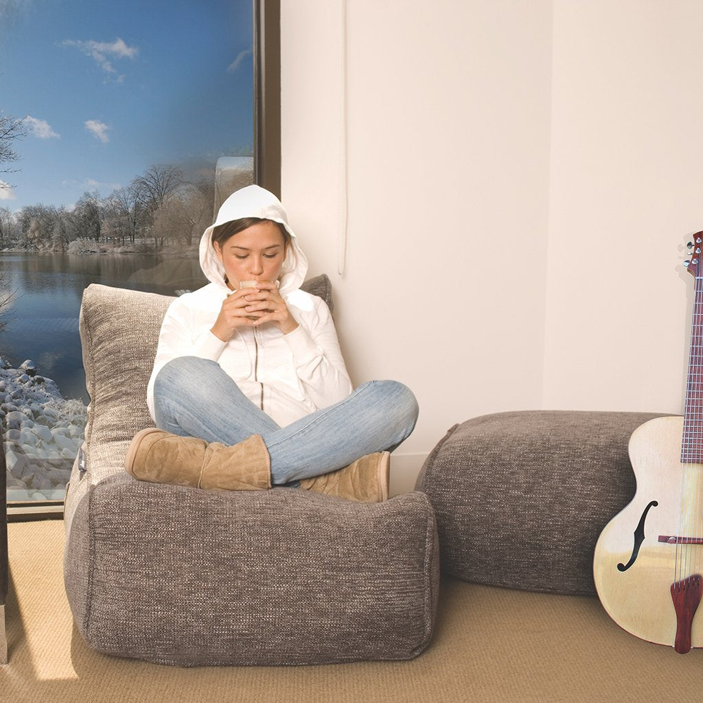 Dieses zweiteilige Set aus dem luxuriösen, grauen Premium-Stoff von Ambient Lounge ist der Inbegriff von Entspannung. Es ist die perfekte, preisgünstige Kombination für ein schwereloses Heimkinoerlebnis. Grau und Silber sind in vielen modernen und stilvollen Interieurs absolut angesagt, und dieser Stoff besticht durch Tiefe, Robustheit, angenehme Haptik und eine hervorragende Ästhetik. Wie ein britischer Architekt kürzlich bemerkte: „Das ist kein einfaches oder langweiliges Grau, sondern hat wunderschöne helle Akzente und einen sehr, sehr dezenten Hauch von metallischem Silber, der dieses Set weit über alles hinaushebt, was ich bisher bei Sitzsäcken gesehen habe. Es sieht sehr edel aus und fühlt sich auch so an.“ Machen Sie sich bereit für Entspannung der Extraklasse mit dem luxuriösen, grauen Chaiselongue-Set von Ambient Lounge Premium.